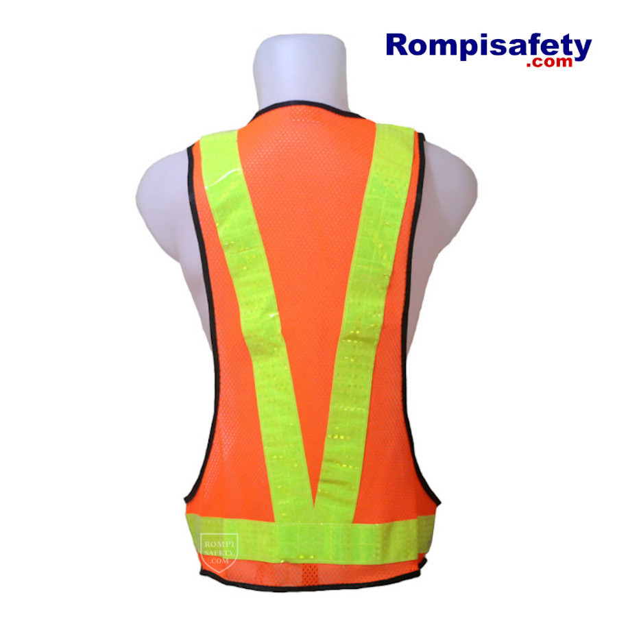 Rompi Safety Jaring V, Oranye, Pita Reflektif Hijau Kekuningan
