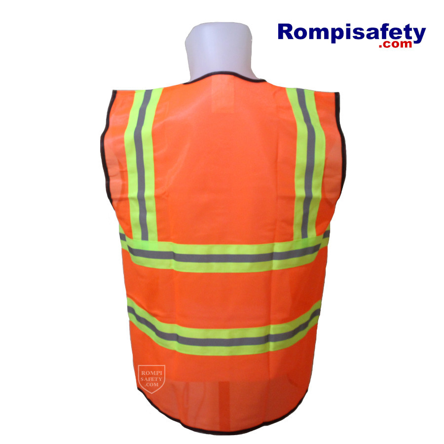 Jual rompi proyek (rompi tambang), warna oranye (orange), dengan lis berwarna hijau kekuningan (lime) pada pita reflektif. Berikut spesifikasi safety vest untuk proyek yang kami jual: